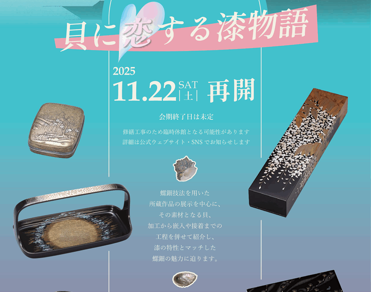 イベント詳細 日付: 2025年11月22 – 12月28日 カテゴリ: 開催中の展覧会 螺鈿技法を用いた所 … 続きを読む 螺鈿―貝に恋する漆物語