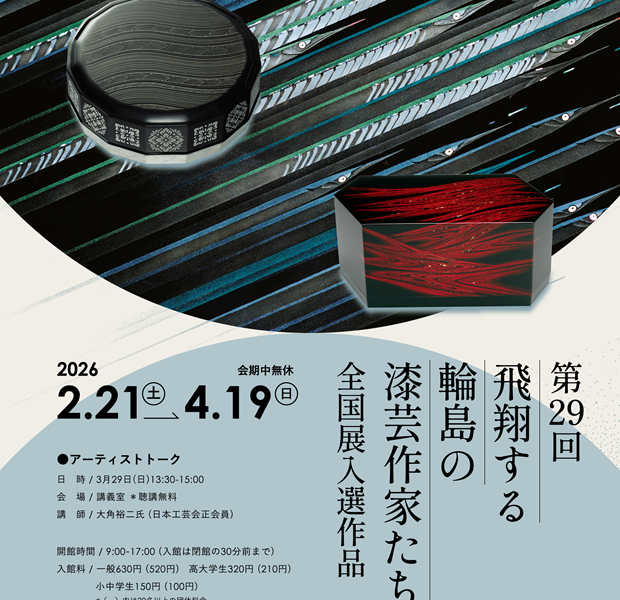 イベント詳細 日付: 2026年2月21 – 4月19日 カテゴリ: 次回開催の展覧会 輪島市在住の漆芸作家 … 続きを読む 第29回飛翔する輪島の漆芸作家たち―全国展入選作品―