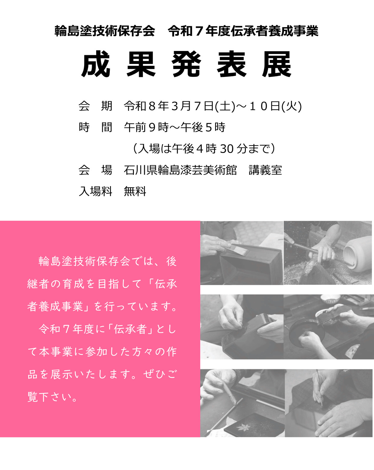 これからのイベント 輪島塗技術保存会 令和7年度伝承者養成事業 成果発表展 2026年3月7日(土)~3月10日(火) *会期中無休 主 催 輪島塗技術保存会 会 場 石川県輪島漆芸美術館 講義室 入場料 無料