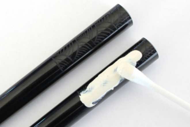あらかじめ文様が彫られたお箸に代用漆をすりこみ、はみ出した分を拭き取ります。
