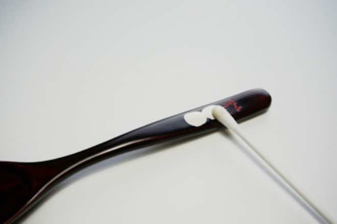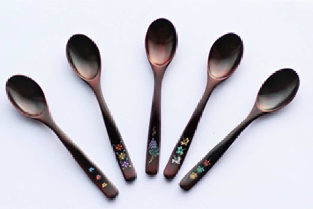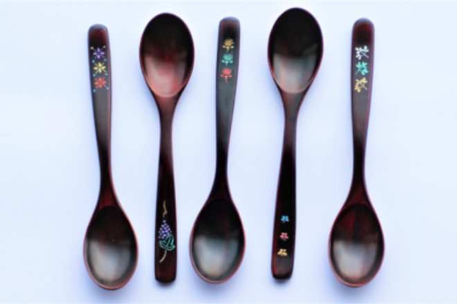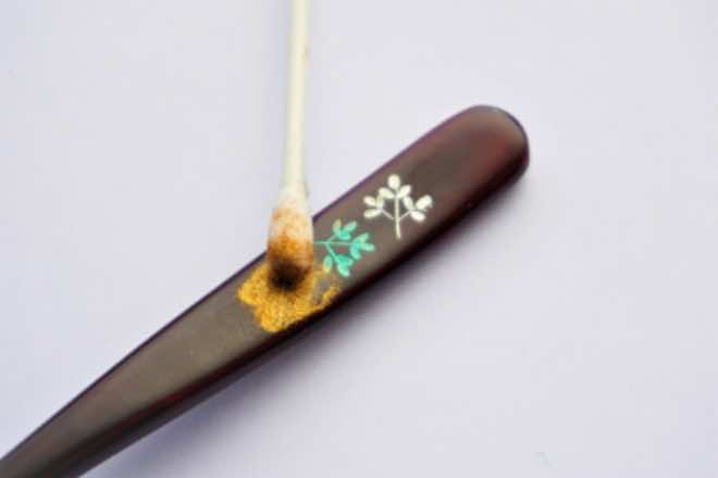あらかじめ文様が彫られたスプーンに代用漆をすりこみ、はみ出した分を拭き取ります。
