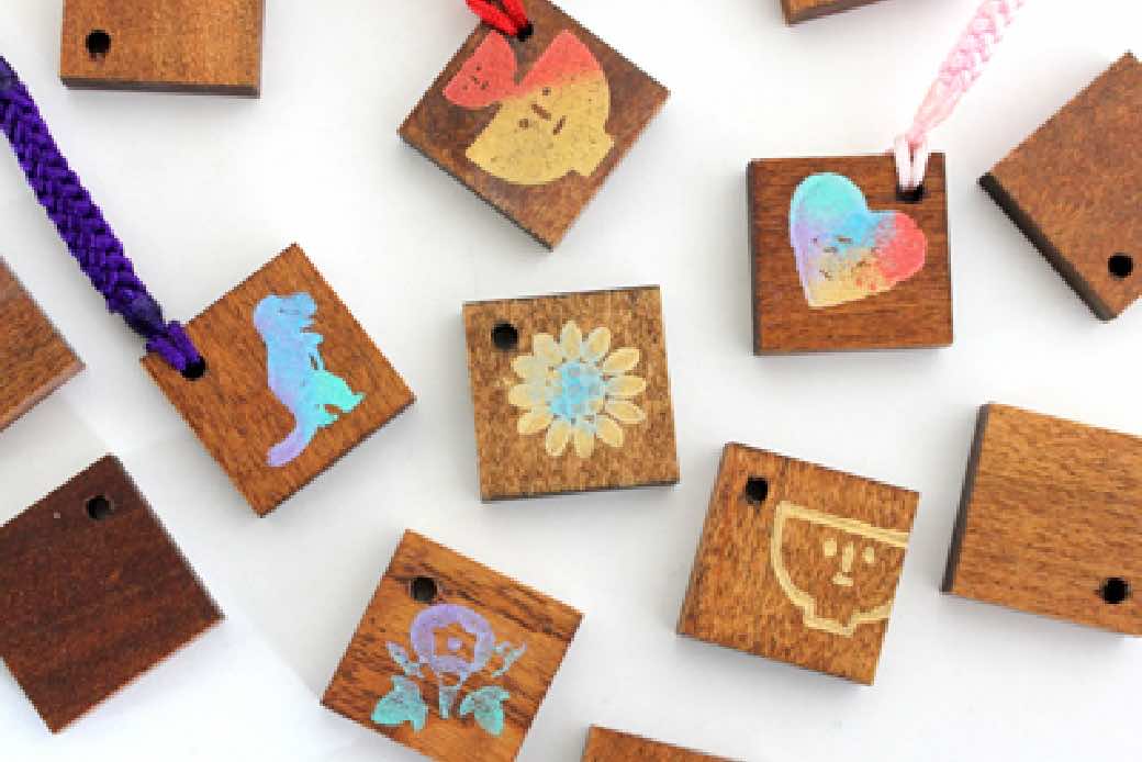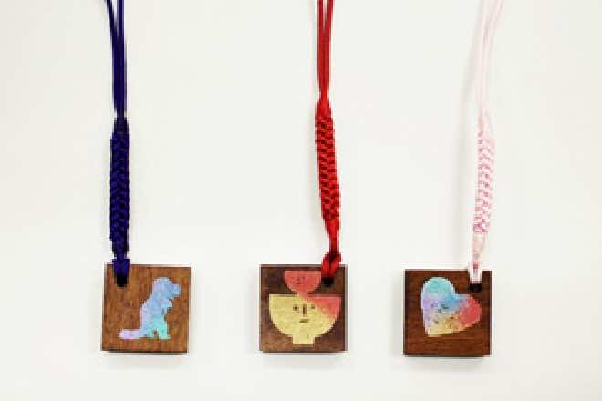 拭き漆(木に生漆をすりこむ技法)を施した木片に、代用漆でスタンプを押します。