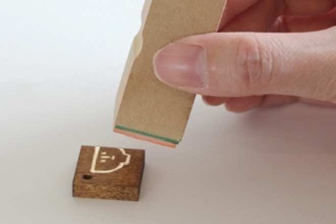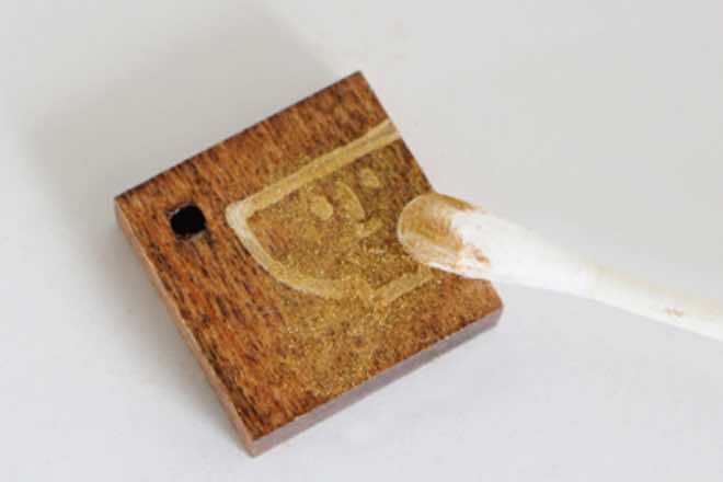 拭き漆を施した木片に、スタンプを押して金属粉で仕上げます。